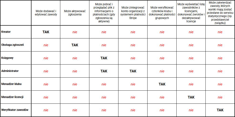 Zwróć uwagę, że role to nie to samo co uprawnienia. O uprawnieniach do edytowania zawodów możesz dowiedzieć się więcej z poradnika Uprawnienia do edycji zawodów.