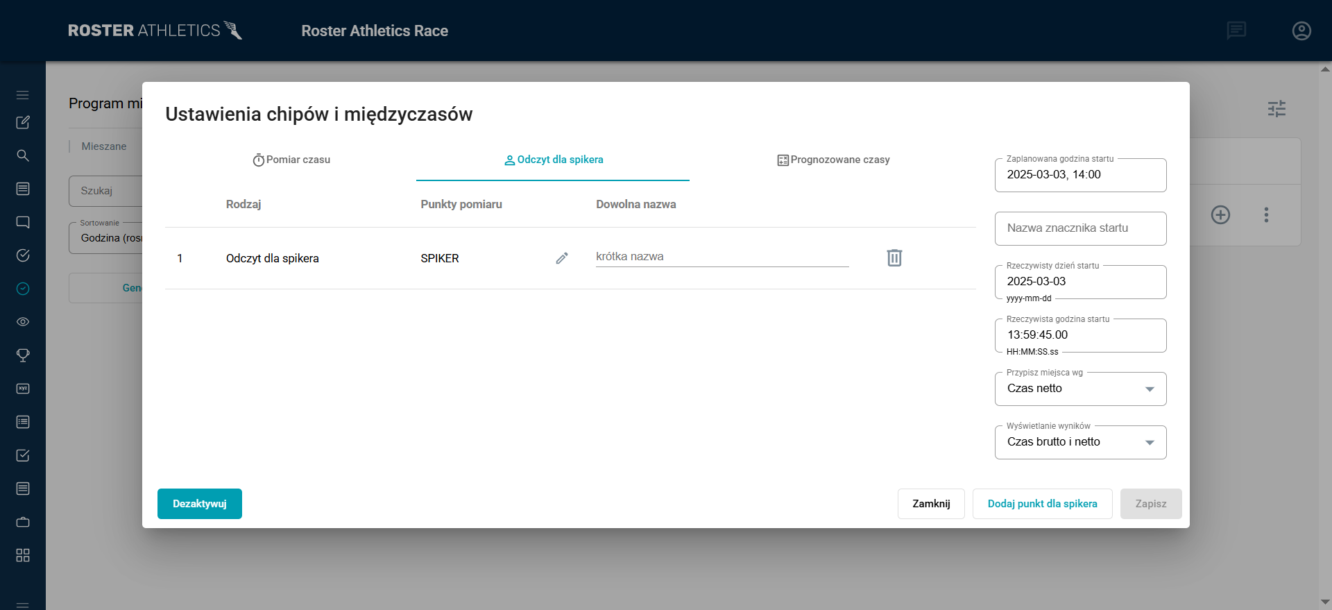- Konfiguracja punktu dla spikera w RACE RESULT