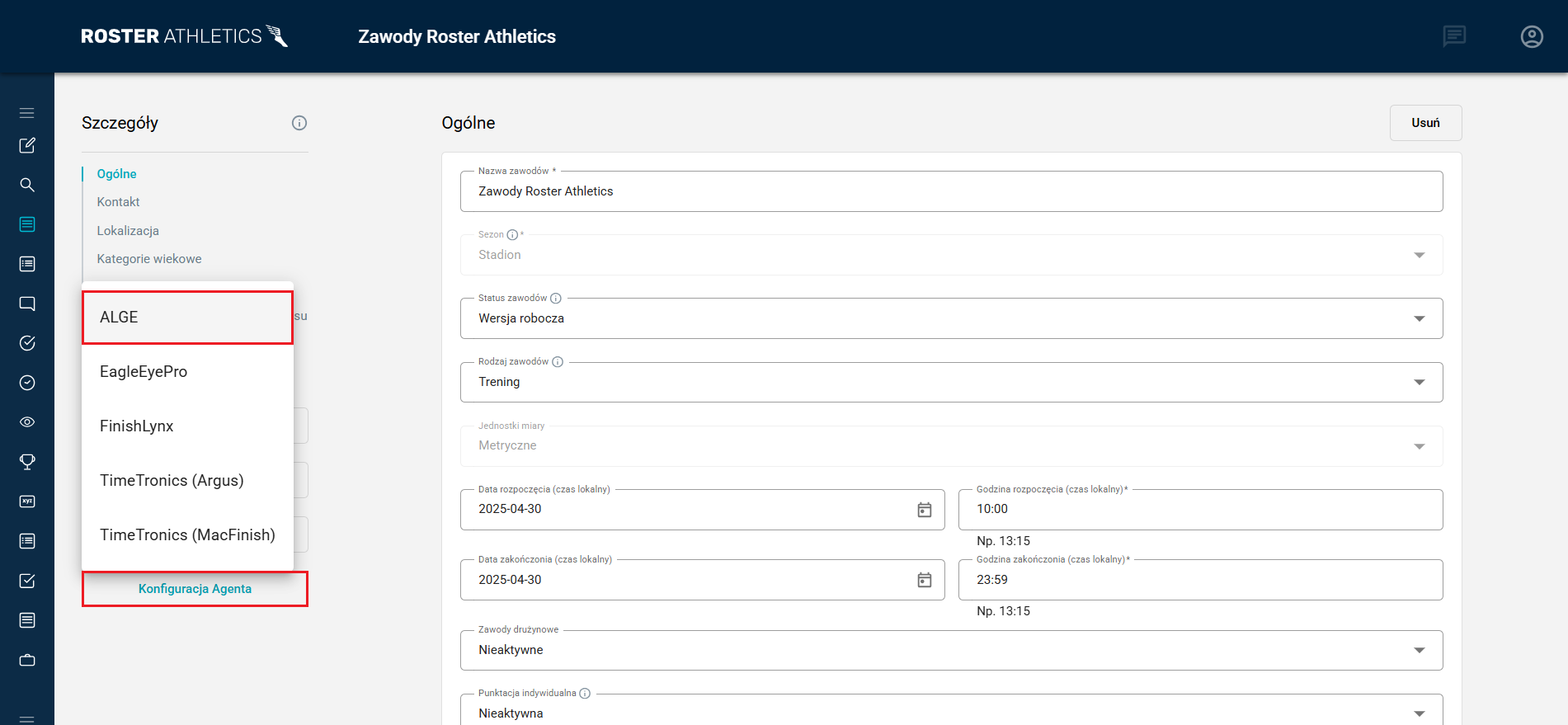 Pozostań w widoku szczegółów zawodów. Po lewej stronie znajdziesz przycisk Konfiguracja Agenta, który należy kliknąć i wybrać ALGE. Ta akcja wywoła pobranie pliku .roster. Zapisz ten plik na swoim komputerze w dowolnym miejscu na dysku.