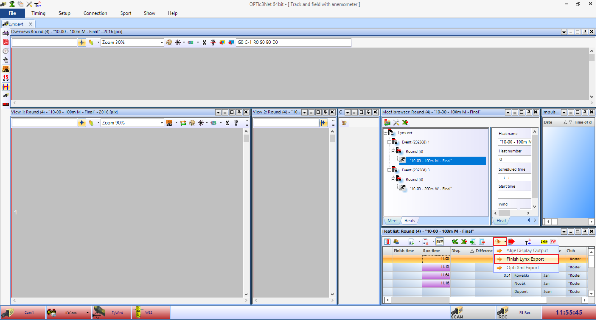 Gdy konkurencja się zakończy i wszystkie wyniki pojawią się w systemie OPTIc3.NET, kliknij ikonę strzałki w oknie Heat list: nazwa konkurencji i wybierz Finish Lynx Export. Ta akcja zapisze plik LIF w folderze, który określono w ustawieniu AutomaticExportDirectory.
