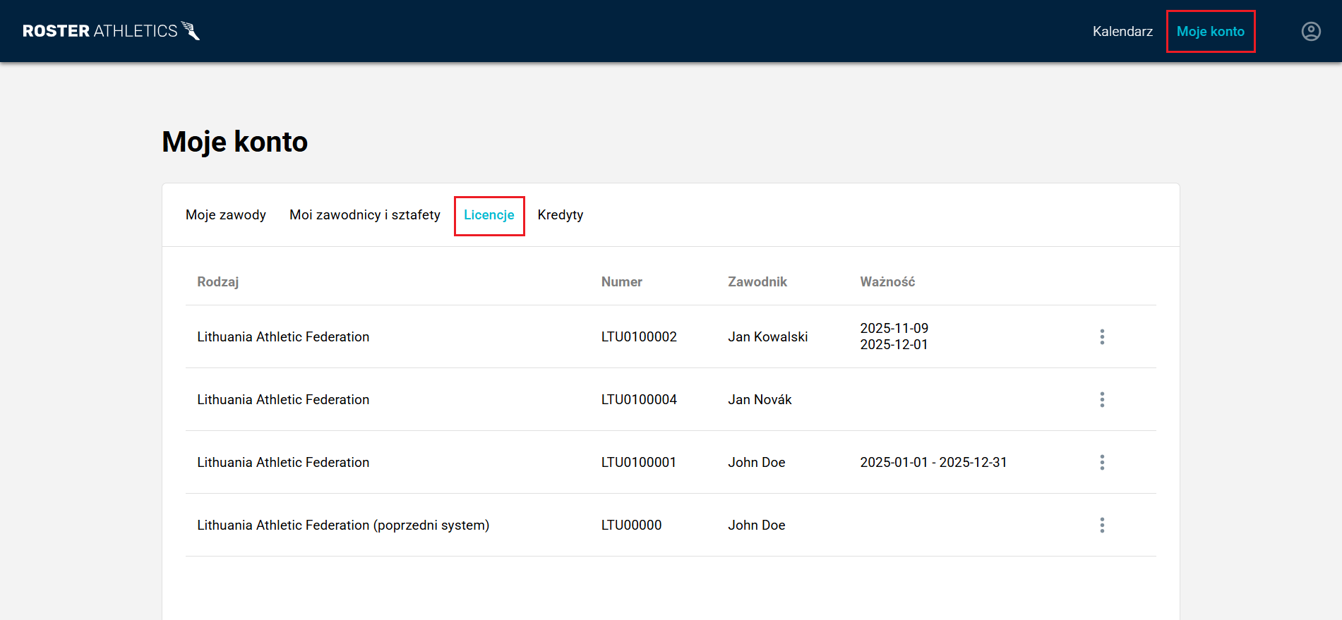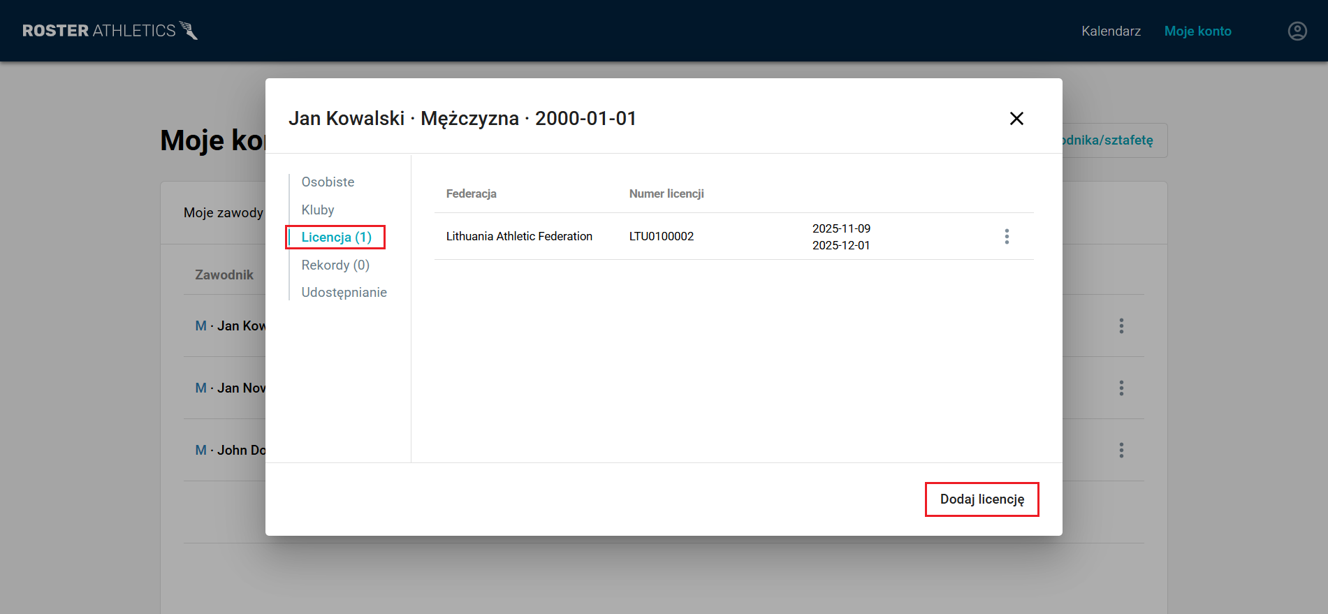 Roster Athletics umożliwia dodanie numerów licencji dla wielu federacji do profilu zawodnika/zawodniczki. W przypadku licencji Litewskiej Federacji Lekkoatletycznej możesz dodawać i opłacać je bezpośrednio w systemie.